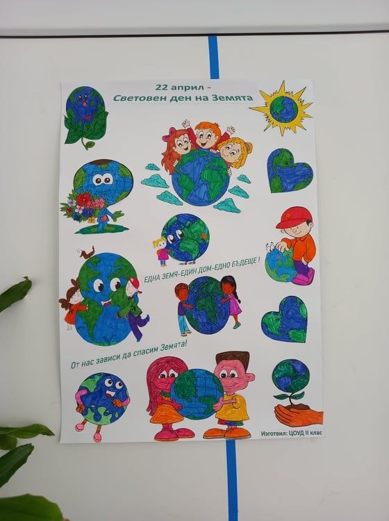 Учениците от групата за целодневна организация на учебния ден - 2. клас отбелязаха Деня на Земята като рисуваха рисунки, апликираха, изготвиха табла и отправиха послания за опазване на природата. Така те показаха, че не са безразлични към нашата планета.