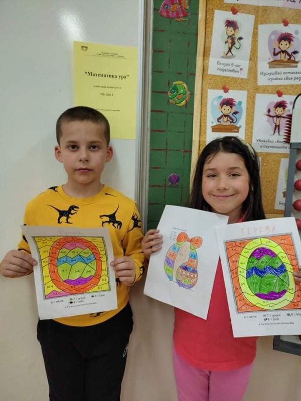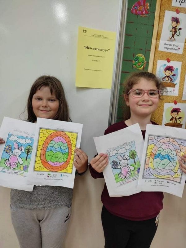 Учениците от 1."в" клас от група по интереси "Математика, ура!", с ръководител г-жа Звезделина Георгиева, съчетаха знанията си по математика с великденските празници. Те решиха с лекота сложните математически задачи от викторината и участваха във великденска изложба на тема "Мога да събирам и изваждам числата до 20 с преминаване".