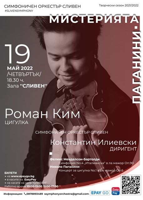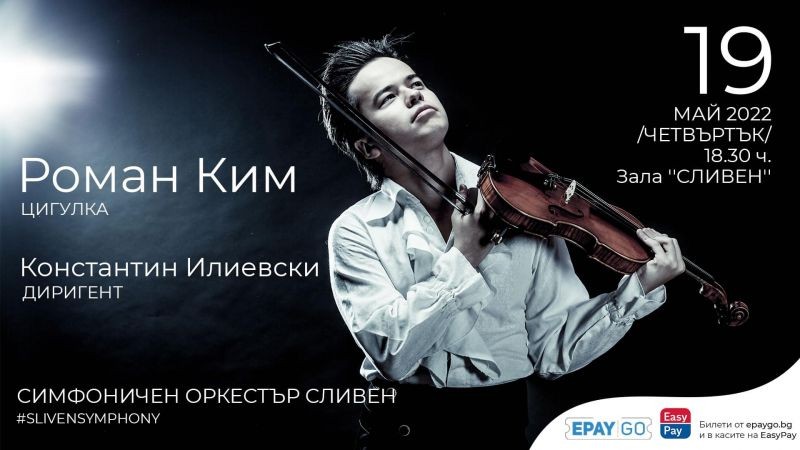 Спиращият дъха виртуоз Роман Ким пристига за първи път в България. Световноизвестният цигулар ще изпълни концерт за цигулка и оркестър No.1, от Николо Паганини със Симфоничен Оркестър Сливен. Ексклузивното събитие ще се проведе на 19 май - четвъртък, от 18.30 ч. в зала „Сливен“.