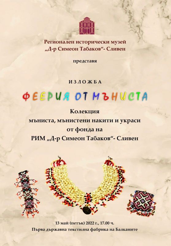 На 13 май 2022 г. предстои да бъде открита временна изложба "Феерия от мъниста", която е дело на Добринка Добрева-Славова, уредник в отдел "Етнография" към РИМ - Сливен. Представена ще бъде колекция от мъниста, мънистени накити и украси от фонда на Регионален исторически музей "Д-р Симеон Табаков" - Сливен.