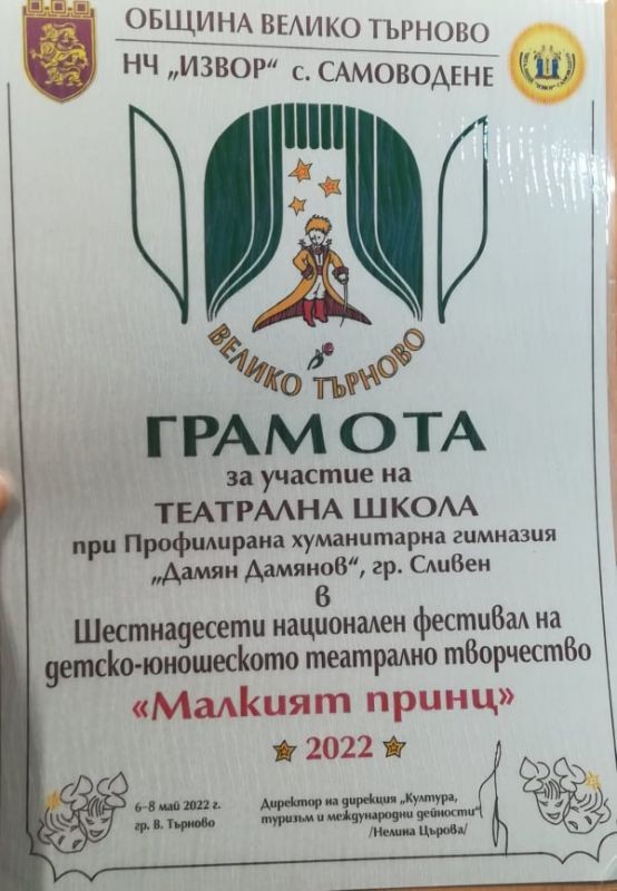 От 6 до 8 май в град Велико Търново за шестнадесети пореден път се проведе Национален фестивал на детско-юношеското театрално творчество „Малкият принц”. Театрална трупа „Опит за летене“ към Хуманитарна гимназия „Дамян Дамянов“, се представи с двата си премиерни спектакъла „Р.У.Р.“ по Карел Чапек и „Боряна“ по Йордан Йовков. Учениците актьори, с ръководител – Николина Велчева, се представиха достойно и успешно сред своите връстници от цялата страна, като имаха възможността да играят на гляма сцена на Музикално-драматичния театър „Константин Кисимов“, гр. Велико Търново. С награда за поддържаща мъжка роля бе удостоен Тервел Дянков за ролята си на Домин в спектаъла „Р.У.Р.“. Трупата получи поощрителни грамоти от журито за участието си на фестивала.