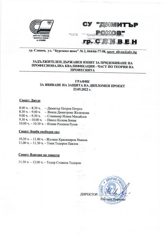 ГРАФИК ЗА ЯВЯВАНЕ НА ЗАЩИТА НА ДИПЛОМЕН ПРОЕКТ - 23.05.2022г.