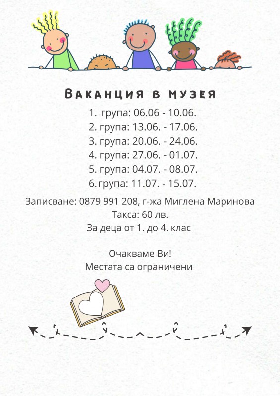 За поредна година Регионален исторически музей - Сливен организира "Ваканция в музея", насочена към деца от 1. до 4. клас. Участниците ще бъдат разпределени в шест групи при следната програма: