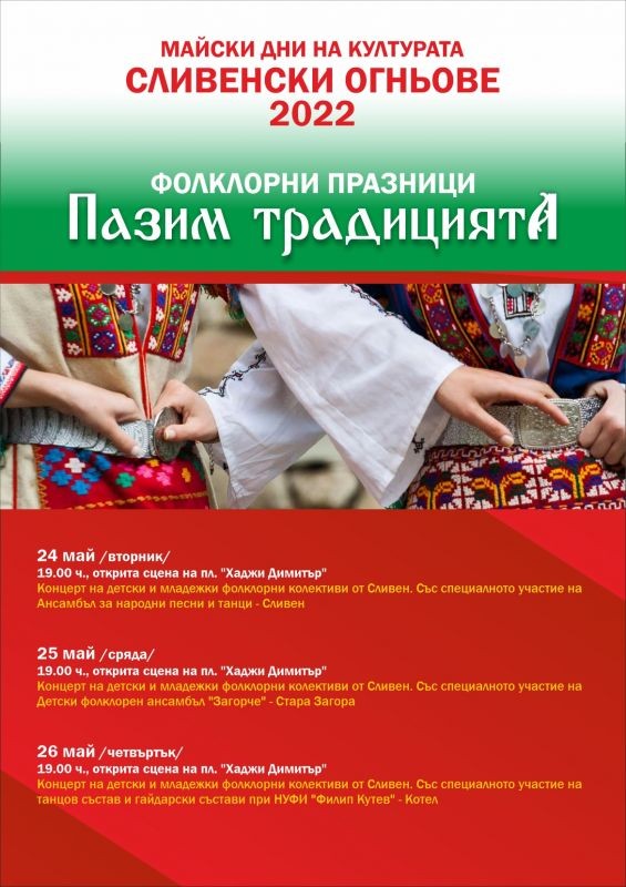 От 24 до 26 май откритата сцена на пл. „Хаджи Димитър“ се превръща в арена на фолклорните празници. В трите вечери, от 19 часа, на сцената ще се изявяват детски и младежки фолклорни танцови колективи от Сливен. Концертите са част от програмата на Фолклорни празници „Пазим традициите“. И в трите вечери ще се включат специални гости - Ансамбъл за народни песни и танци - Сливен на 24 май, Детски фолклорен ансамбъл „Загорче“ - гр. Стара Загора на 25 май , а на 26 май, на сцената ще излязат НУФИ „Филип Кутев“ - Котел.