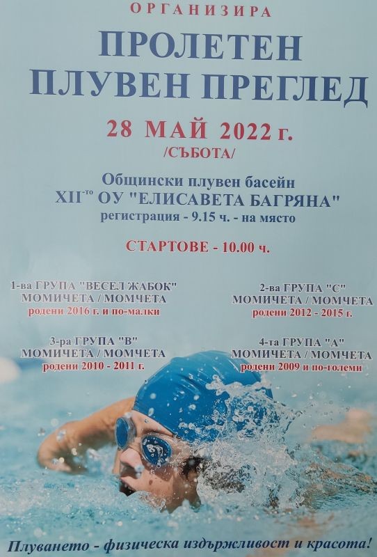 Общинският плувен басейн в Сливен ще бъде домакин на първото състезание след пускането му в експлоатация и стопанисването му от страна на Общината. Пролетният плувен турнир ще се проведе на 28 май – събота, от 9,30 до 12 часа.