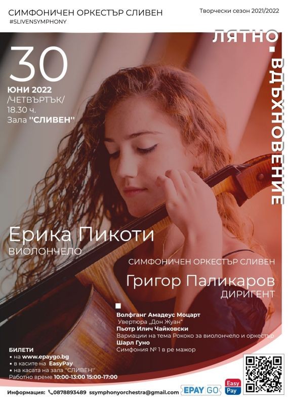 Симфоничен оркестър Сливен закрива творческия си сезон с бляскаво събитие на 30 юни. То ще се състои в зала „Сливен” от 18.30 ч. След поредицата от успешни концерти, този път публиката ще има възможност да чуе и види на сцената италианското вдъхновение, виолончелистката Ерика Пикоти и изключителния български диригент Григор Паликаров.