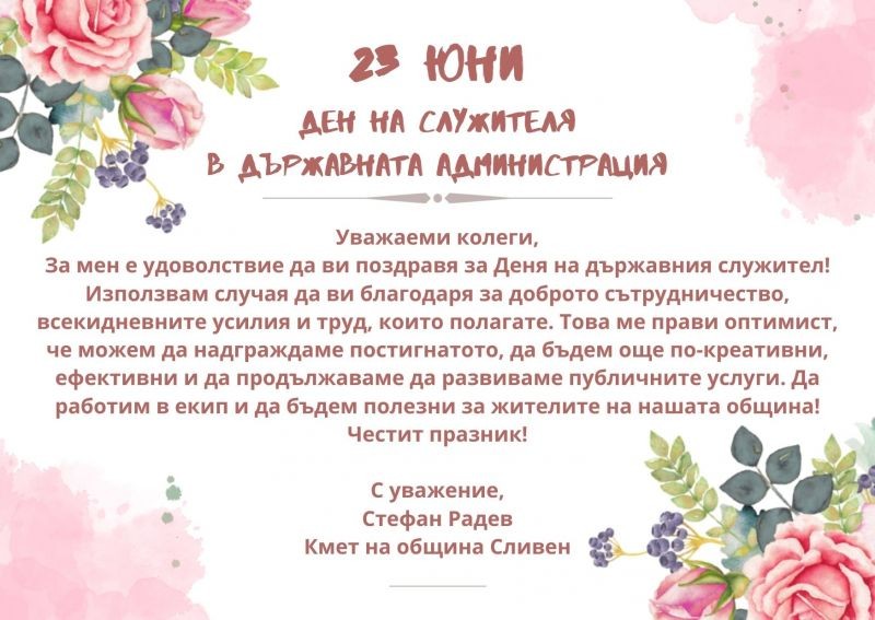 Служителите от българската държавна администрация днес отбелязват своя професионален празник. По този повод кметът Стефан Радев поздрави служителите в Общинска администрация. Той използва случая да благодари на всички експерти и специалисти, за доброто сътрудничество, всекидневните усилия и труд, които полагат.