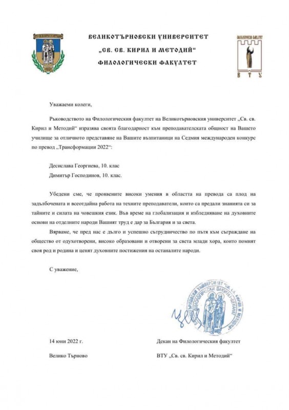 Изключително сме радостни да съобщим, че на 24.06.2022 г. Десислава Георгиева и Димитър Господинов от 10 а клас от ПГПЗЕ „Захарий Стоянов“ получиха сертификати за участие в VII международен конкурс по превод „Трансформации 2022“, организиран от Великотърновския университет.