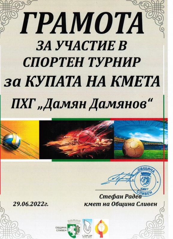 Днес – 29 юни, се проведоха спортни състезания между сливенски училища в първия турнир за „Купата на кмета“, организиран от Община Сливен, в партньорство с Местната комисия за борба срещу противообществените прояви на малолетните и непълнолетните /МКБППМН/ и Общински съвет по наркотични вещества и Превантивно-информационен център – Сливен. Хуманитарна гимназия „Дамян Дамянов“ се включи в две от състезанията – по футбол и по волейбол. Поздравяваме футболистите и волейболистите ни с достойното представяне и им пожелаваме по пътя към успехите да не забравят духа на спортсменството и честната игра!