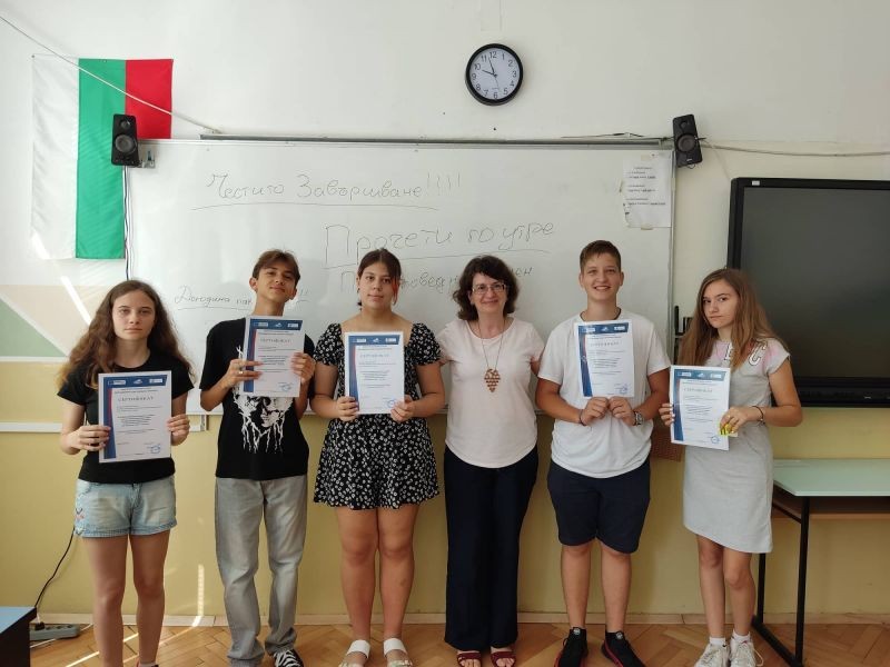 Изби последният учебен звънец за тази година. Направихме последните учебни дни по-цветни и интересни – изнесохме класните стаи навън, под черницата, и се забавлявахме – рисувахме, дебатирахме, имитирахме, решавахме кръстословици на английски. След трудните учебни дни усещането за идващата ваканция е опияняващо. Разделяме се до есента, с пожелания за дълго, светло и щастливо лято!