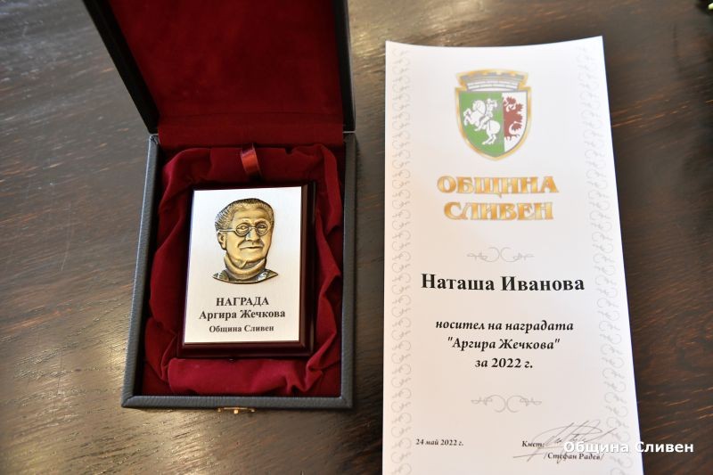 Кметът Стефан Радев посрещна днес в Общината определената за носител на наградата „Аргира Жечкова“ за 2022 г. – Наташа Иванова. Тя получи лично от сливенския градоначалник отличието, придружено с плакет и грамота. Наташа Иванова е директор на Спортно училище „Димитър Рохов“ и бе номинирана от педагогическия съвет на училището. По лични и уважителни причини, тя не присъства на официалната церемония на 24 май в зала „Сливен“, на която бяха наградени с почетни отличия учители от община Сливен, за приноса и дейността си в образователната система. Наташа Иванова бе определена за носител на приза за 2022 г., с решение на Обществената комисия за определяне на носителката на наградата „Аргира Жечкова“.