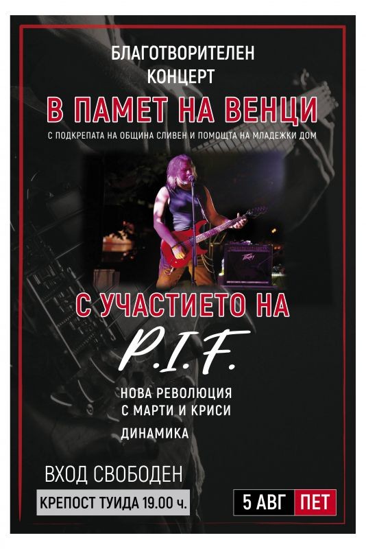 Благотворителен концерт в памет на Венцислав Василев - Венци от Нова Революция и Димо от P.I.F ще се проведе този петък, 5 август, на откритата сцена на Късноантична и средновековна крепост „Туида“. Музикалната програма на вечерта е със специалното участие на група P.I.F и домакините Нова Революция, Dynamic Project.
