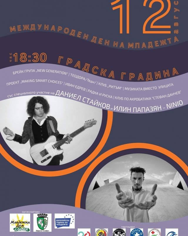 Много музика, танци и различни спортни демонстрации са включени в програмата на концерта, посветен на Международния ден на младежта. Той се организира от Младежки дом-Сливен и ще се проведе утре, 12 август в Градската градина. Със свои изпълнения ще се включат брейк група „New generation“, с ръководител Борис Панайотов към Военен клуб, Школа за поп и рок изпълнители „Ритъм“, с вокален педагог Елена Пеева към Военен клуб, Иван Едрев, Радка и Руска от защитено жилище, Теодора от „Св. Стилиян Детепазител“. В концерта ще участват още Илин Папазян - NINIO и Даниел Стайков /участници в „Гласът на България“/, музикантите от проекта „Музиката вместо улицата“, Спортен клуб по акробатика „Стефан Данчев“ и др.