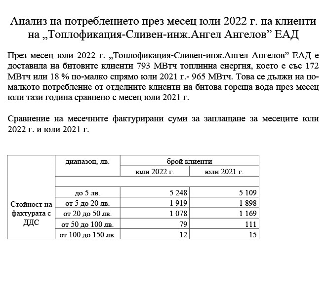 Анализ на потреблението през месец юли 2022 г. на клиенти на „Топлофикация-Сливен-инж.Ангел Ангелов” ЕАД