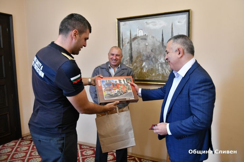 На среща днес кметът Стефан Радев беше запознат от директора на Регионална дирекция „Пожарна безопасност и защита на населението“ комисар Владимир Демирев с модификацията на машината. Бяха обсъдени и впечатленията от престоя на сливенските огнеборци в немската противопожарна служба. От свое име и от името на колегите си, комисар Демирев изказа благодарност към Община Сливен, която е финансирала транспортирането на автомобила до България. От името на своя колега и началник на пожарната в Кьолн Ралф Ласман, той връчи на кмета Радев емблема на немската пожарна и тематични подаръци. Сливенският градоначалник благодари за жеста и вниманието, като подчерта, че новата придобивка ще е в помощ на жителите на общината и служителите на пожарната. Той изпрати благодарствен адрес за дарението до противопожарната служба в Кьолн.