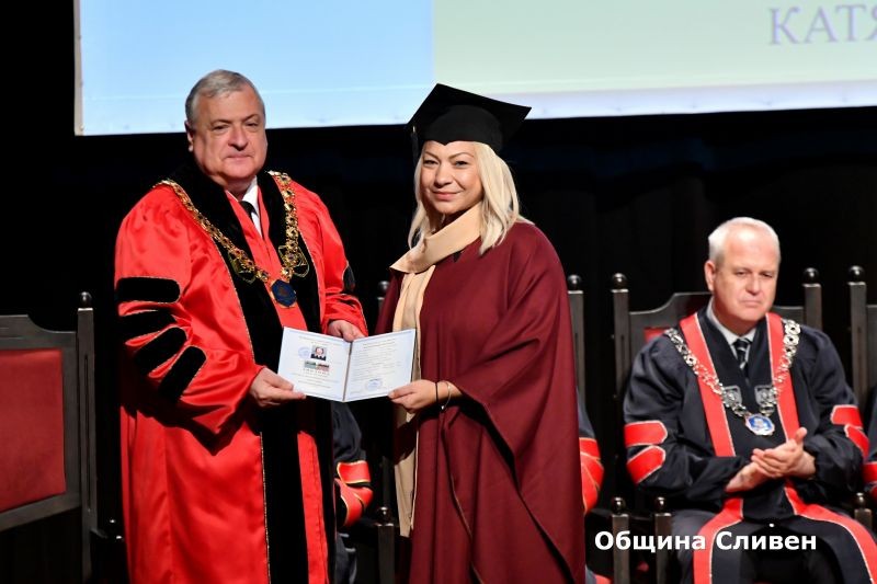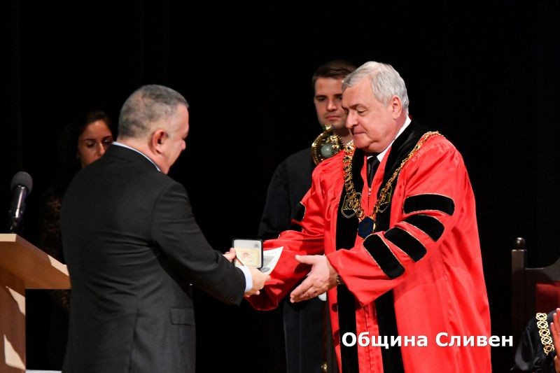 „Искам да поздравя всички Ви с избора, който сте направили. Като общество, като държава ние имаме нужда от Вас. България и Сливен имат нужда от Вас“, каза кметът Радев в обръщението си към абсолвентките. Той подчерта, че Община Сливен, като един от големите работодатели, ще се бори да ги задържи и ще работи за още по-добри условия за упражняване на професиите им. Градоначалникът поздрави родителите за подкрепата им, както и преподавателите за вложените в обучението енергия и дух, които са предали на студентите си. В знак на признателност Стефан Радев връчи на проф. Игнатов посветена на Сливен юбилейна монета, издадена от БНБ, с изображение на един от символите на града – Стария бряст.