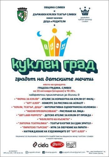 Градската градина утре, на 25 октомври, ще се превърне в арена на куклите и ще зарадва най-малките жители на община Сливен. Тази година „Куклен град - градът на детските мечти“, е посветен на празника на Сливен – Димитровден. Събитието се реализира по инициатива на Държавния куклен театър и Община Сливен, с подкрепата на Общински фонд „Култура“. За малчуганите са предвидени ателиета за изработка на кукли, конкурс за рисунка на асфалт, интерактивна сценографска изложба, рисуване на лица, театър, игри и още куп изненади. Началото на кукления празник е от 10.30 ч.