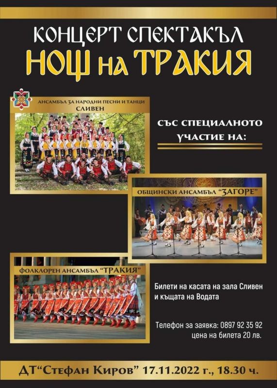 Концерт на Ансамбъла за народни песни и танци-Сливен ще се проведе на 17 ноември от 18,30 часа на сцената на Драматичен театър „Стефан Киров“. Спектакълът се нарича „Нощ на Тракия“ и репертоарът включва изпълнения от тракийската фолклорна област. Специални участници в концерта ще бъдат Общински ансамбъл „Загоре“-Стара Загора и фолклорен ансамбъл „Тракия“ – Пловдив.