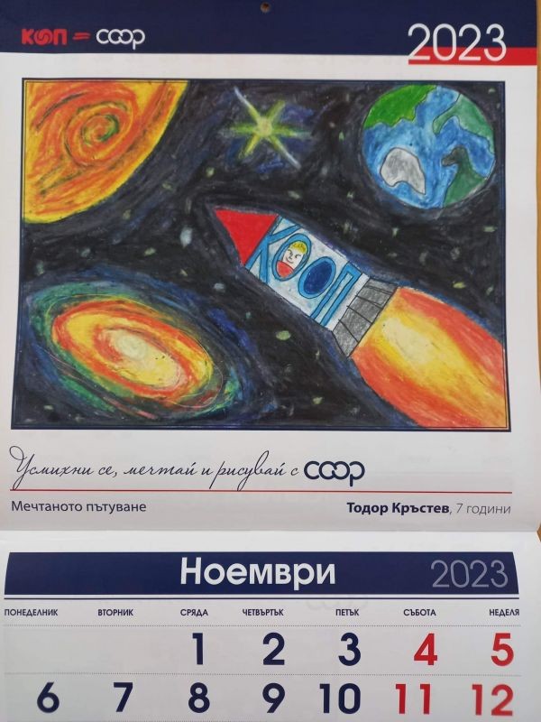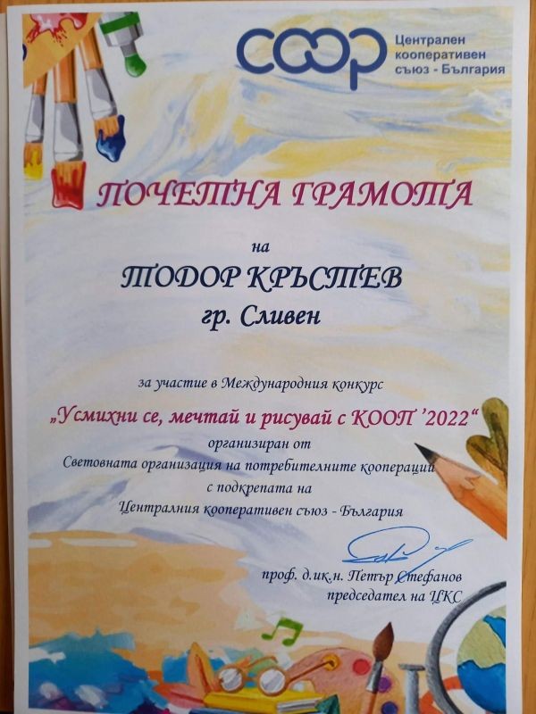 Тодор Кръстев със своята мечта за космоса, изобразена в рисунка, спечели признанието на журито на конкурса „Усмихни се, мечтай и рисувай с КООП 2022“. Наградата бе връчена лично от председателя на КООП - Сливен, госпожа Катя Минчева.