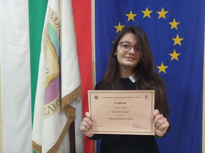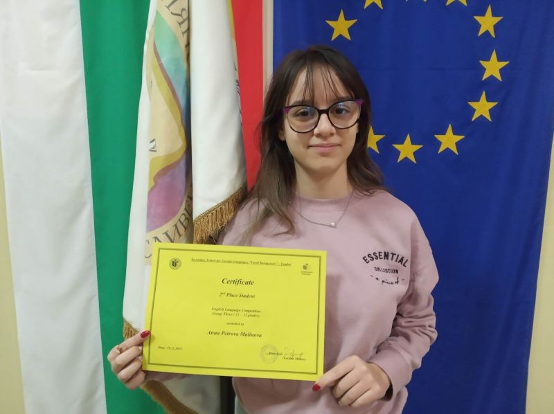 Анна Малинова от XIIа клас и Биляна Георгиева от Xа клас получиха своите грамоти и награди от Езиковата гимназия „Васил Карагьозов“ в Ямбол. Двете момичета участваха в конкурса за писане на есе на английски език, посветен на празника на гимназията. Биляна се класира на първо място във възрастова група IX-X клас, а Анна зае второ място в групата XI-XII клас, само на точка след победителя.