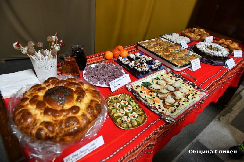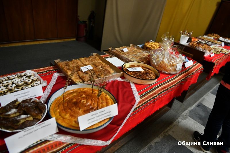 Във фоайето на залата бе подредена кулинарна изложба. Присъстващите опитаха няколко вида точени баници със сирене и масло, солени предястия, различни кексове и сладки, захаросани череши, приготвени по семейни рецепти.
