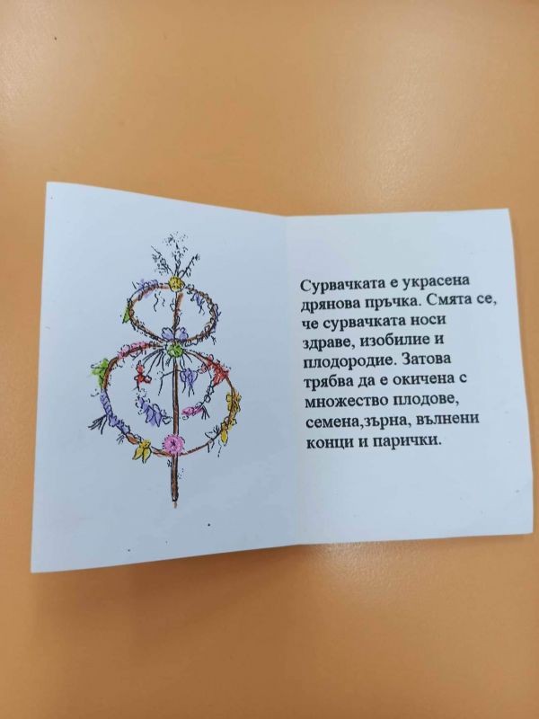 Невероятната фантазия на всички родители създаде десетки оригинални идеи. Децата и техните родители вложиха много творчество и старание, ръководейки се от народната традиция. Те украсиха сурвачките с естествени материали и декорираха дряновите пръчки със сушени плодове, пуканки, кравайчета, бял и червен конец. Учениците поздравиха своите родители със сурвакарски наричания, които имат смисъл на благословии за здраве, щастие и благополучие през новата година. Сурвакарски поздрав отправиха и към г-жа Величка Христова, директор на нашето училище. От изработените сурвакници се подреди пъстра автентична изложба.