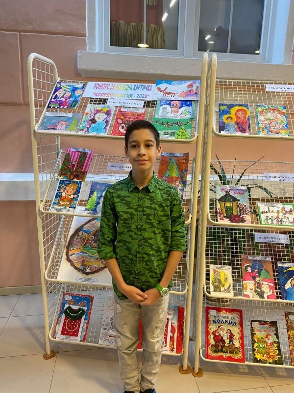 За четиринадесета поредна година, в навечерието на най-чакания, на най-обичания от децата празник, Регионална библиотека "Сава Доброплодни" организира Конкурс за коледна картичка и оригинално коледно пожелание "Коледна магия“ – 2022, за да поощри децата и тийнейджърите да пресъздадат коледната магия – светла, красива и съзидателна. Спортистът от 5а клас Александър Иванов беше награден с грамота, предметна награда и безплатен абонамент за библиотеката! Да му пожелаем здраве и още много успешни начинания! Весели празници!