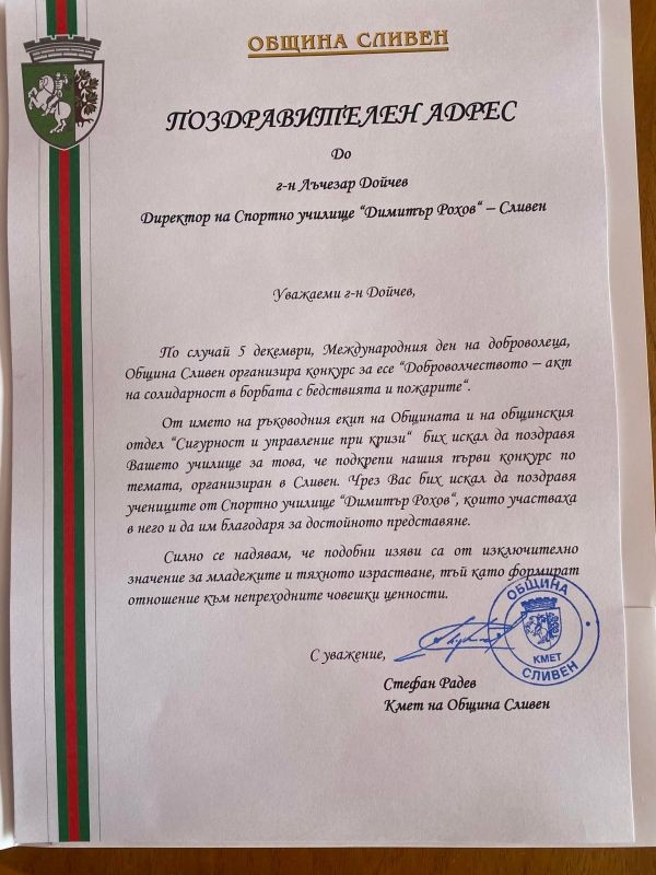 По случай Международния ден на доброволеца - 5 декември, Главна дирекция “Пожарна безопастност и защита на населението” към Министерство на вътрешните работи и “Национална асоциация на доброволците в Република България” в партньорство с Министерството на образованието и науката и Министерство на младежта и спорта бе организиран конкурс за есе по темата! Християна Василева от 10а бе отличена с награда и достойно представи Спортното училище! Поздравления Хриси!