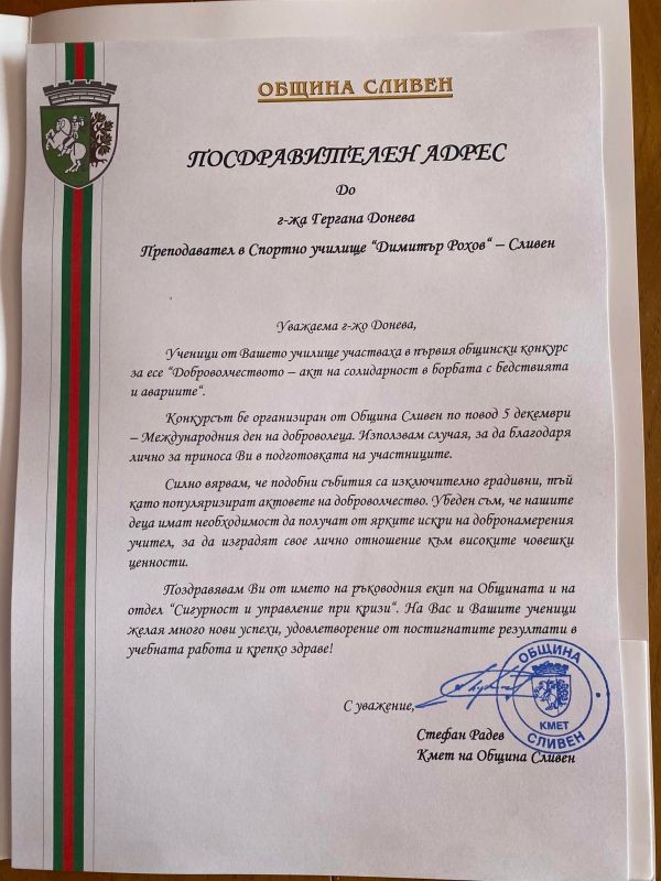 По случай Международния ден на доброволеца - 5 декември, Главна дирекция “Пожарна безопастност и защита на населението” към Министерство на вътрешните работи и “Национална асоциация на доброволците в Република България” в партньорство с Министерството на образованието и науката и Министерство на младежта и спорта бе организиран конкурс за есе по темата! Християна Василева от 10а бе отличена с награда и достойно представи Спортното училище! Поздравления Хриси!