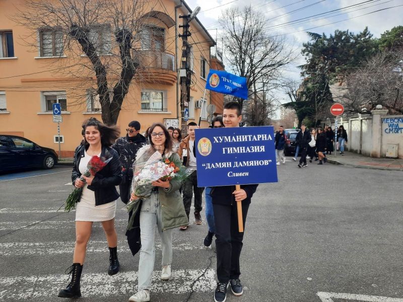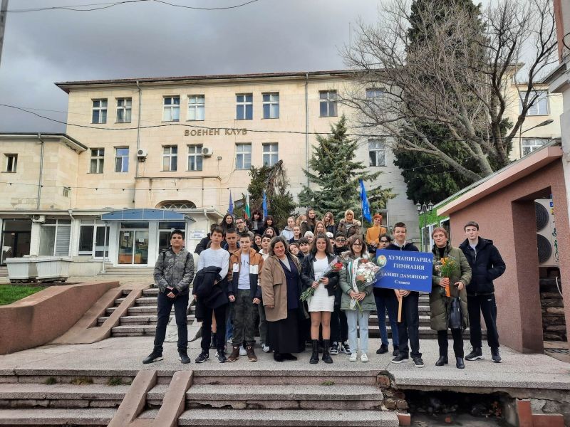 На 18 януари 2023 година се навършиха 88 години от рождението на Дамян Дамянов – бележит наш съгражданин, голям поет и патрон на Хуманитарната гимназия в Сливен. В празничния за училището ни ден посрещнахме като скъп гост Надежда Захариева – съпруга на поета. Заедно с нея поднесохме цветя на признателност пред паметната плоча на Дамян Дамянов – на мястото, където е бил родният му дом. В нашата инициатива се включи и Община Сливен в лицето на кмета Стефан Радев, зам.-кмета Пепа Чиликова и Лидия Димитрова – председател на постоянната комисия по образование, наука, култура и вероизповедания към Общински съвет – Сливен.
