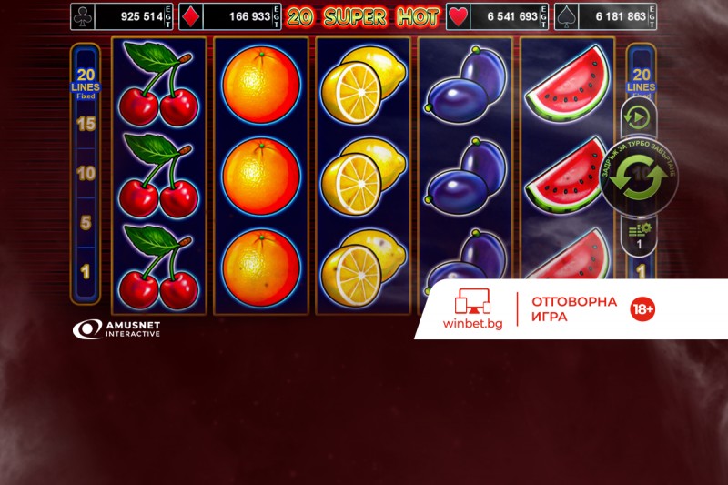 Плодовата ротативка с 20 линии 20 Super Hot е една от най-популярните казино игри на българския разработчик Amusnet Interactive. Както се досещате, повечето символи тук са плодчета, а линиите за игра са фиксирани и не могат да бъдат регулирани от играчите. Звездата играе ролята на скатер, а седмѝцата изпълнява функцията на уайлд и може да замени всички останали символи, но без скатера.