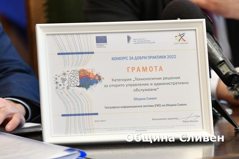 Община Сливен получи още едно отличие за изминалата 2022 г. То е от провел се конкурс за добри практики на Института по публична администрация. Основната му цел е да се насърчава креативността на служителите в администрацията, да бъде платформа за споделяне на знание и да стимулира прилагането на принципите на добро управление.