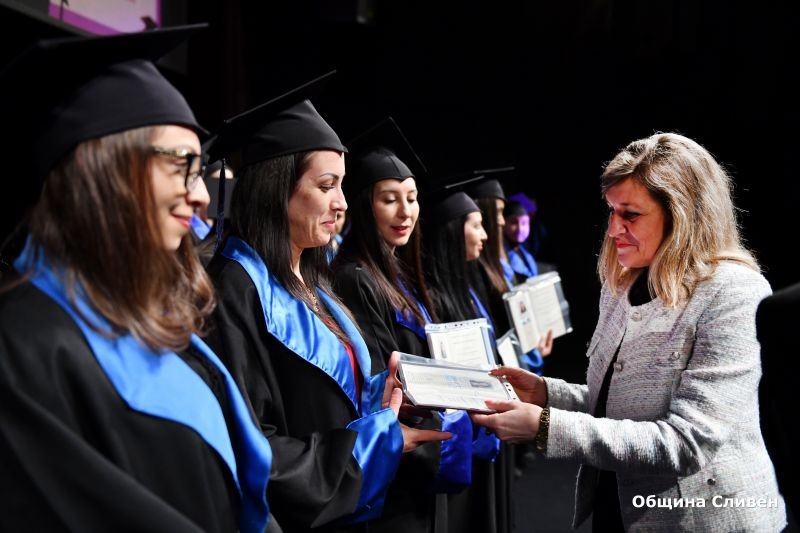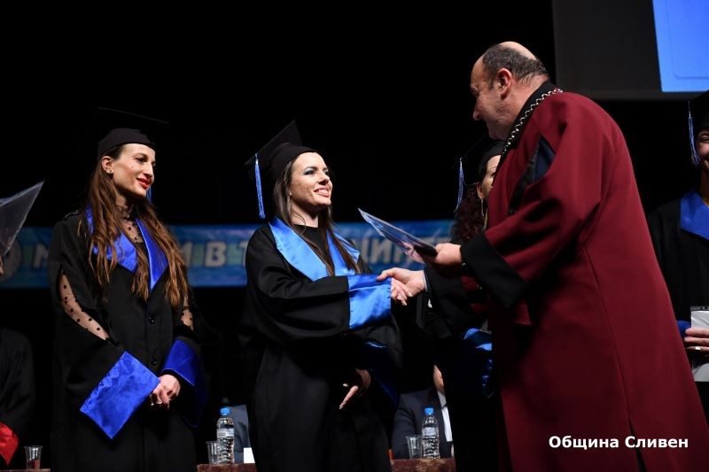 На официалната церемония 62 професионални бакалаври, 100 бакалаври и 305 магистри получиха своите дипломи за висше образование. Във випуска на завършващите са и първите 25 педагози, успешно дипломирали се по специалността „Педагогика”. Част от дипломите на абсолвентите връчи председателят на Постоянната комисия по образование, наука, култура и вероизповедания към Общински съвет-Сливен Лидия Димитрова, която бе сред официалните гости на събитието.