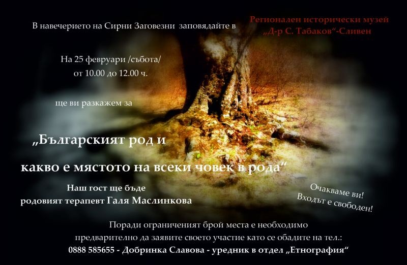 На 25 февруари (събота), в навечерието на Сирни Заговезни, заповядайте в сградата на Регионален исторически музей "Д-р Симеон Табаков" – Сливен от 10:00 ч. Заедно с нашия гост-лектор – родовият терапевт Галя Маслинкова, ще Ви разкажем за „Българския род и какво е мястото на всеки човек в рода“. Поради ограничения брой на местата е необходимо да заявите своето участие предварително на Добринка Славова – уредник в отдел „Етнография“ на телефон 0888 585 655. Очакваме Ви!