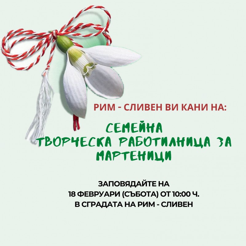На 18 февруари (събота) от 10:00 ч. до 12:00 ч. в сградата на Регионален исторически музей "Д-р Симеон Табаков" – Сливен ще се проведе семейна творческа работилница за мартеници. Участниците ще се запознаят с традиционните вярвания, обичаи и представи, свързани с 1-ви март. Заедно с музейните ни педагози, децата и техните родители ще могат да проявят творчество и да изработят свои мартеници.