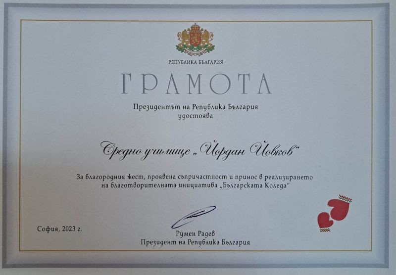 БЛАГОДАРСТВЕН АДРЕС ЗА ПРИНОС В РЕАЛИЗИРАНЕТО НА БЛАГОТВОРИТЕЛНАТА ИНИЦИАТИВА "БЪЛГАРСКАТА КОЛЕДА"