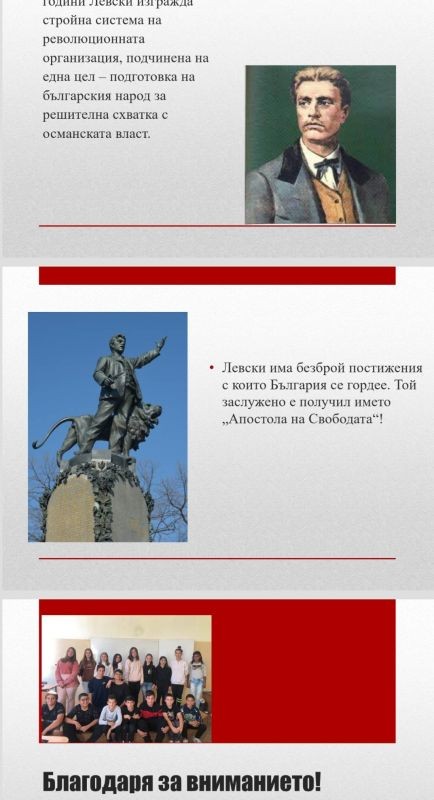 Младите патриоти представиха кратка презентация за живота и делото на Васил Левски, изработиха табло посветено на 150 - годишнината от гибелта му и приключиха с рецитал на стихотворението „Обесването на Васил Левски“.