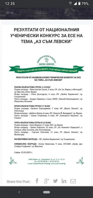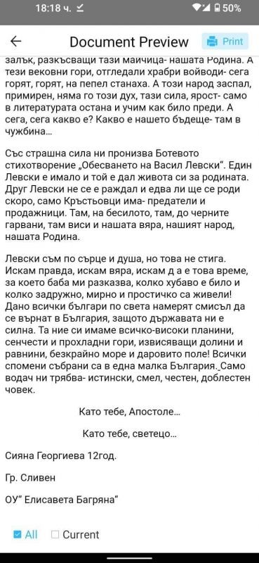 Представяме Ви прочувствените и силни думи, с които Сияна Георгиева от VI “в” клас успя да грабне журито в националния конкурс за есе на тема "Аз съм Левски". Тя се класира на почетното трето място.