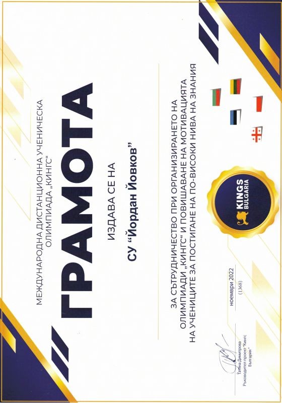 Училището ни също бе удостоено с грамота за сътрудничество при организирането на олимпиади "КИНГС" и повишаване на мотивацията на учениците за постигане на по-високи нива на знания.