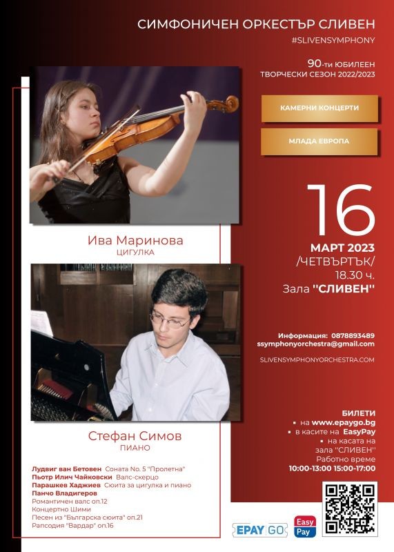 Пианистът Стефан Симов и Ива Маринова - цигулка, представят трудна и взискателна, но богата и живописна музикална програма на сливенска сцена. Двамата са едни от най-изявените и най-награждавани млади музикални таланти на България. На 16 март пред сливенската публика те участват в камерен концерт от цикъла „Млада Европа“ на тазгодишния юбилеен сезон на Сливенския симфоничен оркестър.