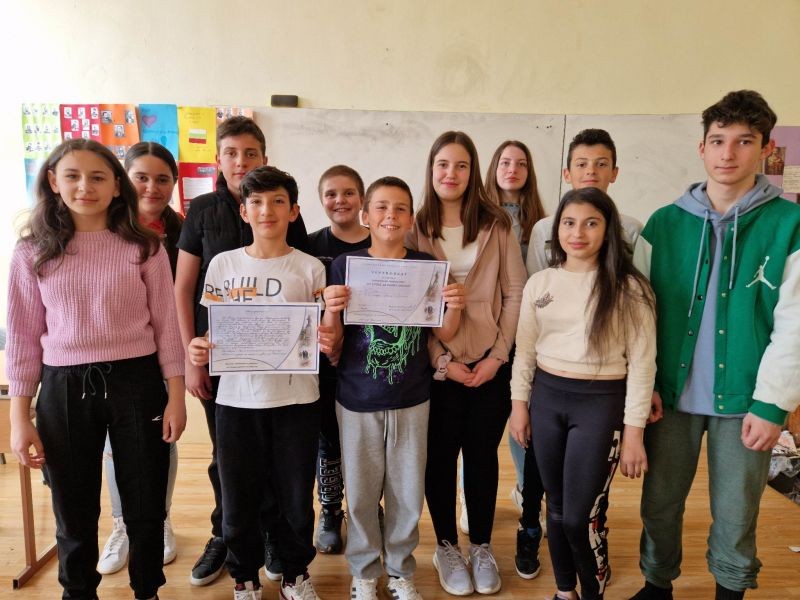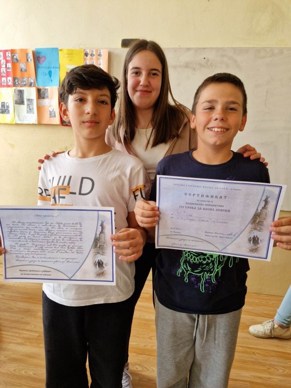 Учениците от 6. клас и участници в клуб „Млади възрожденци“ при СУ „Йордан Йовков“ – Сливен получиха сертификат за участие в национална инициатива „150 урока за Васил Левски“. Младите патриоти проведоха поредица от инициативи посветени на Апостола.