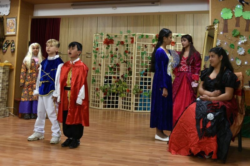 Зам. кметът Пепа Чиликова поздрави училището от името на кмета Радев и от свое имеТанцът на принца и Пепеляшка в нощта на балаТрадиционен индийски танц изпълни талантлива ученичка от клуб "Веселие"Мащехата на Пепеляшка и дъщерите й /вдясно на снимката/Пепеляшка и добрата й орисницаПепеляшкаМалките танцьорки от клуб "Веселие"Песента "Хубавата Джиджи" - тримата й братя са най-отпред на снимкатаХубавата Джиджи - изпълнителката изигра и ролята на майката на принца в приказкатаПаисий пише своята "История..."децата от вокална група "Четвъртинка"Вдещите на концертаФиналът на празника: деца и учители пеят заедноДецата посрещнаха гостите си