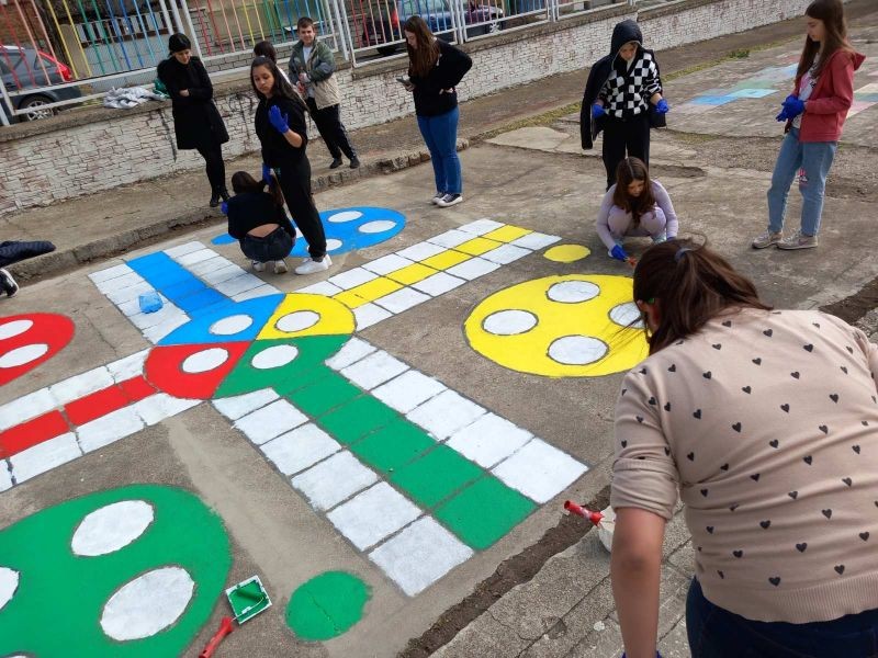 Учениците от 6 клас сами решиха да демонстрират умения в сферата на изобразителното изкуство, като прецизно подновят рисуваните игри на двора: Не се сърди човече, Дама и др.