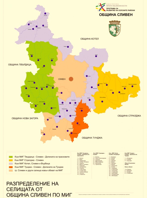 В рамките на изпълнение на тези проекти, ще се създадат нови Местни инициативни групи между селата от община Сливен със следното разпределение: Община Тунджа и селата: Крушаре, Чокоба и Бозаджии; Общини Котел и Върбица и селата: Божевци, Изгрев, Ичера, Зайчаре, Камен , Гергевец, Раково, Самуилово, Сотиря, Средорек, Стара река, Тополчане, Глуфишево, Николаево, Панаретовци, Мечкарево.