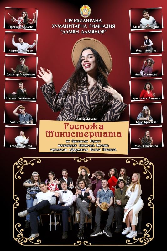 С голямо вълнение ви каним на втората премиера на Театрална трупа „Опит за летене“ за учебната 2022/2023 година. Заповядайте на комедията „Госпожа Министершата“ по Бранислав Нушич на 5 април 2023 г. в зала Сливен от 18:30 ч. Нашите актьори от 12.клас решиха да се разделят с усмивка със своята любима публика, като работиха вдъхновено и целенасочено в стилистиката на сатиричния театър. Очакваме с голямо нетърпение да споделим театралния празник с вас. Входът е свободен.