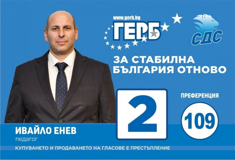 Най-голямата партия в България - ГЕРБ, която е част от Европейската народна партия в ЕП, е единственият политически субект в страната, който може да внесе стабилност и сигурност за българските граждани. Това заяви кандидатът за народен представител от листата с номер 2 Ивайло Енев, който е и зам.-кмет на Община Нова Загора. „ГЕРБ-СДС трябва да поемат отново управлението на страната, защото в момента цари пълен хаос и несигурност. За мен две са основните неща, с които трябва да се заемем. На първо място е необходим спешен диалог с национално отговорните партии за съставяне на действащ редовен кабинет и второ задължително стабилизиране на финансите, като предпоставка за овладяване на ситуацията с цените и инфлацията“, каза Ивайло Енев.