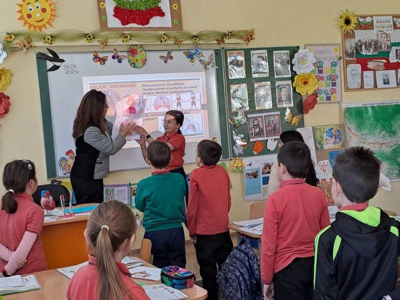 Интересен открит урок на тема "Човешкото тяло" изнесе г-жа Ивелина Иванова пред учениците от 3. "в" клас от ОУ "Елисавета Багряна". В него имаше различни дейности - изграждане на макет на бял дроб, работа с пластилин - червени кръвни клетки, бели кръвни клетки, както и тромбоцити, които помагат на раните да хващат коричка, редене на пъзел, гатанки и игрословици. Накрая учениците сами предложиха здравословни съвети как да се грижат за своето тяло.