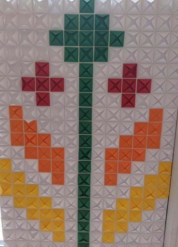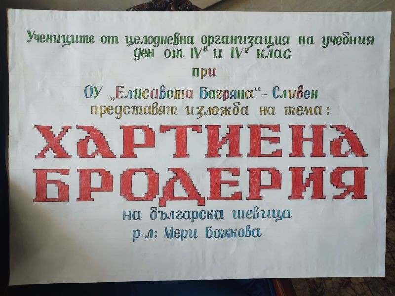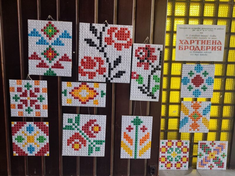 Изложбата е на тема "Хартиена бродерия" и е дело на учениците от целодневна организация на учебния ден от групата на 4. "в" и 4. "г" клас и тяхната учителка г-жа Мери Божкова.