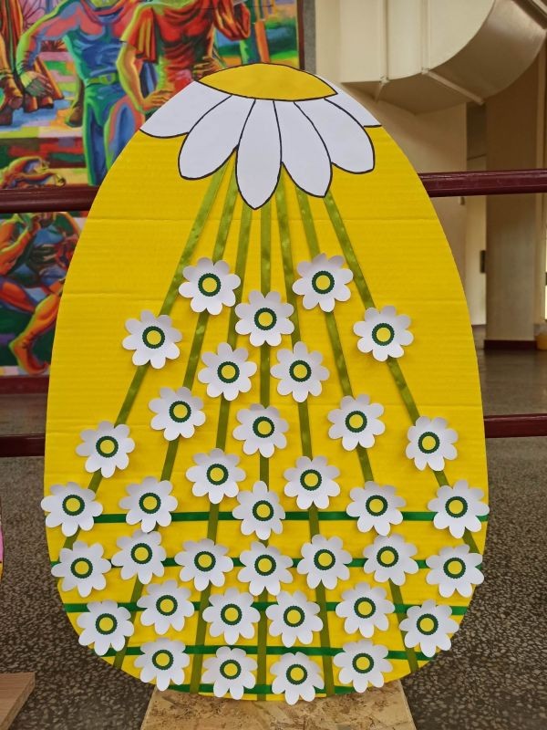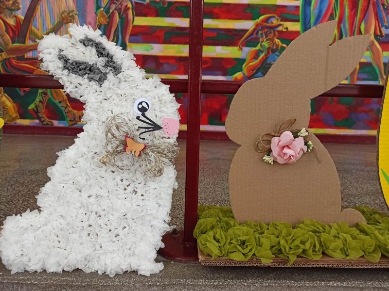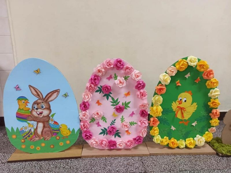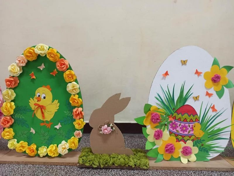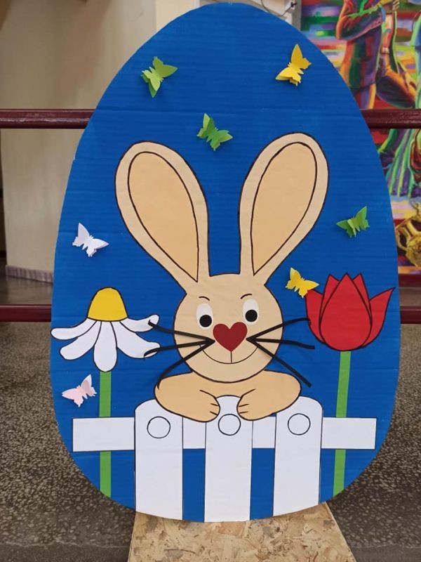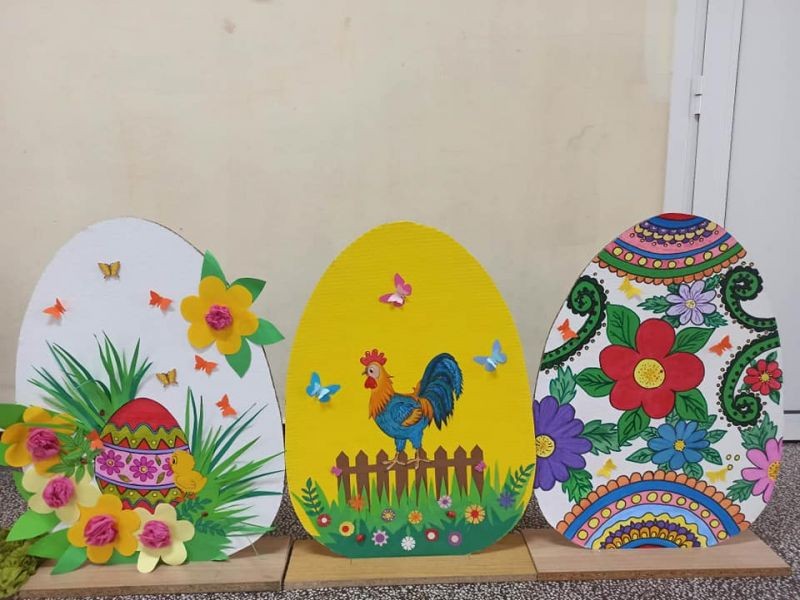 Яйцата и зайчетата са направени от картон, а за изработката им е използвана различна техника. Без съмнение резултатът от работата е отличен.