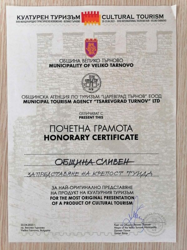 Награда за най-оригинално представяне на продукт на културния туризъм получи Община Сливен на XVIII-тото издание на Международното изложение „Културен туризъм“ във Велико Търново. Отличието бе за представянето на най-новата сливенска дестинация – Крепостта „Туида“.